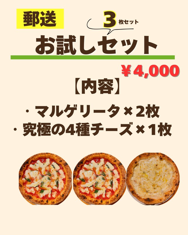 冷凍ピッツァ お試しセット【郵送/数量限定】 \まずは気軽に食べてみたい方におすすめ!/ 本格ナポリピッツァをご自宅で手軽に味わえる、人気の冷凍ピッツァをセットにしました。 【セット内容】 ・オーガニックマルゲリータ × 2枚 ・究極の4種チーズピッツァ × 1枚 計3枚入り 税込3,500円 こだわりの味をそのまま急速冷凍! 石窯で焼き上げた、香ばしいもちもち生地。 素材にもとことんこだわり、添加物は不使用。 お子様から大人まで安心してお召し上がりいただけます。 ⏰ 忙しい日の救世主にも! 「習い事の前にさっと食べさせられて便利!」 「冷凍庫にあると心強い!」とママたちからもご好評です。 ※注意事項※ ご注文後、発送手続きを行いますが、配達にはお時間がかかる場合がありますので、予めご了承ください。 商品の特性上、日にち指定や他商品との同梱はお受けできませんのでご了承ください。 (時間指定がある場合は、備考欄にお書きください)